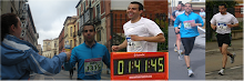 nada mas entrar en la corredera me encontré a una conocida y con ella llegue hasta casi santo domingo donde decidí ir un poco mas rápido dado que me encontraba muy bien y había mucha gente. al final de ordoño me encontré al compañero con el que suelo correr a veces y con su grupo fuí charlando hasta el principio de la cuesta de unicef donde le deje diciéndole que iba a tirar un poco mas. no había cogido agua en el avitualllamiento ni tampoco la había dejado al principio de esa calle donde parece ser había una zona de evacuacion de líquidos. desde el final de la cuesta y hasta el polígono de la palomera fui solo y todo el rato pasando a otros corredores y no es que yo fuera rápido sino que había salido detrás de todo el mundo. ahí me llamo un excompañero de la cruz roja y la verdad es que me alegro el paso; la gente muy bien y aunque no se oían muchos aplausos o ánimos el hecho de verles ahí me hacia sentir acompañado. en la calle ancha me esperaba mi mujer y mi hijo con una botella de aquarius, esto no se si se considera dopping, y el pequeño me hizo una foto. de ahí hasta la piscina del ejido fui muy bien y en este punto estaba mi madre, hermano, tía y mi abuelo de 90 años al que pare para darle un beso, ojala se haya enterado que era yo. al entrar en el camino de la candamia me encontré con el globo de 1:45´que iba animando a la gente y tras superarlo y saber que había pasado el Km 15 me animó a seguir mi ritmo. seguía pasando gente y así llegue a la lastra donde me encontré a mi compi de entrenamiento (desde enero y siempre que he podido hemos corrido juntos) y a uno de los artífices de mediamaratonleon y con ellos me quede, ¡no pude encontrar mejor compañía para llegar a la meta!. la recta de José aguado y el corte ingles fueron algo duros pero el final, tras girar la rotonda de la plaza de toros me encanto. Mis tiempos: